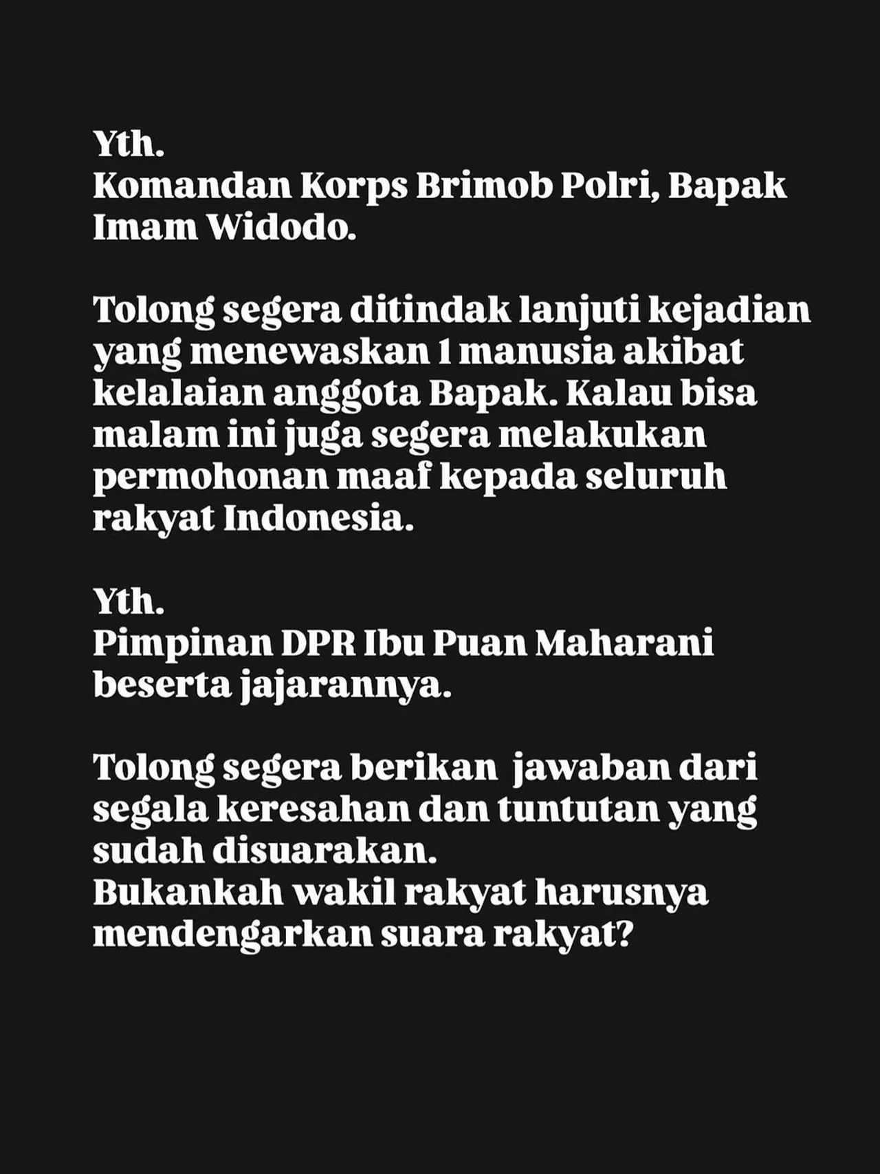 in BeritaKomika Kiky Saputri terang-terangan menulis surat terbuka untuk Ketua DPR RI Puan Maharani dan Komandan Korps Brimob Polri, Imam Widodo, dengan latar hitam polos pertanda dukacita mendalam. Surat terbuka bintang komedi situasi Lapor Pak! ini merespons kabar Affan Kurniawan, pengemudi ojek daring yang tewas dilindas rantis brimob di tengah demonstrasi yang menjalar di sejumlah ruas…